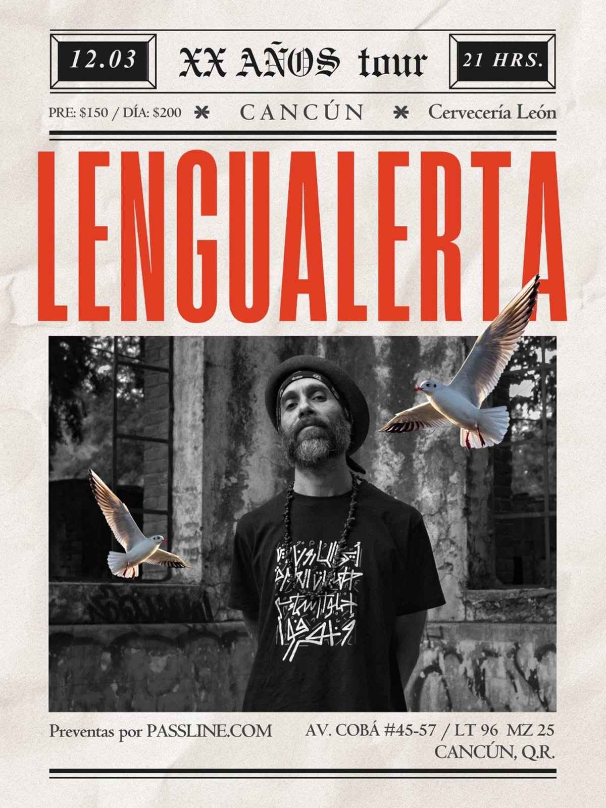 | Lengualerta | Concierto con Estelar | N/A | Cervecería León | Av. Coba LT 96, M 12, SM 25 | Cancún | Quintana Roo | México | |